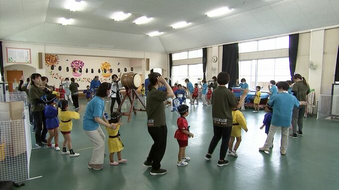 園児らは踊り連のメンバーから振り付けを教わり、太鼓や三味線にあわせて伝統の踊りに挑戦しました。