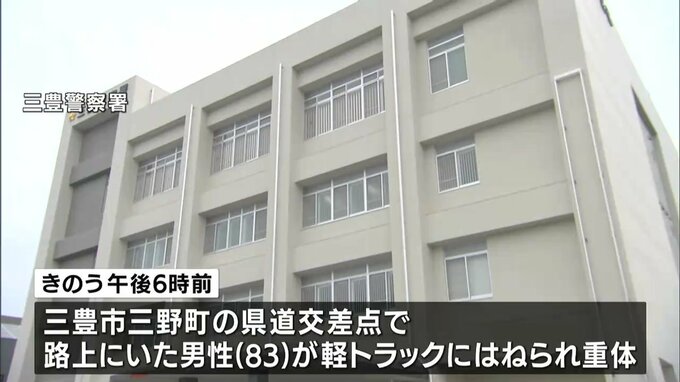 香川県では、きのう(4日)午後6時前、三豊市三野町の県道交差点で、路上にいた83歳の男性が右折してきた軽トラックにはねられ意識不明の重体となっています。軽トラックを運転していた三豊市詫間町の71歳の男性に、けがはありませんでした。警察が事故の原因を調べています。