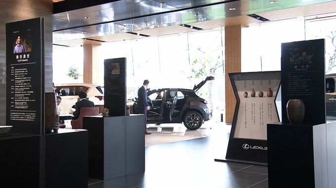展示されている車の横に備前焼の花入れや茶器など作品10点が並びます。岡山市南区のレクサス岡山ショールムで始まった「備前焼展示~土と炎~」です。45歳までの作家が所属する岡山県備前焼陶友会青年部が実施するものです。