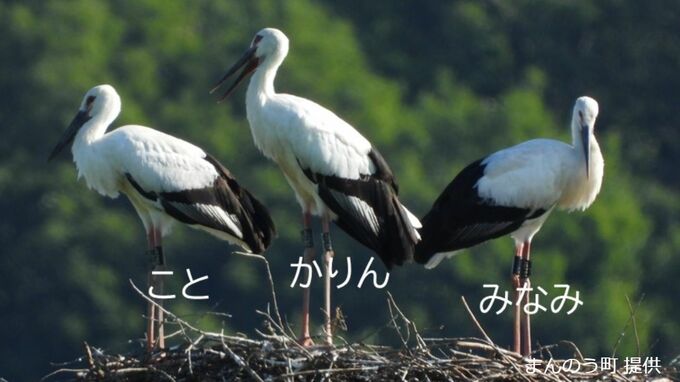 香川県まんのう町で今年春に誕生し元気に成長しているコウノトリ3羽の愛称が「かりん」「こと」「みなみ」に決まりました。