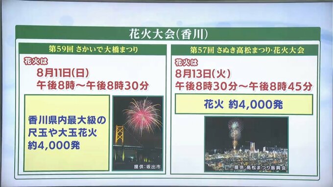 続いて、香川です。来月(8月)11日開催の「第59回さかいで大橋まつり」では、香川県内最大級の尺玉などが音楽とレーザーに合わせて打ち上げられます。瀬戸大橋をバックに坂出の夜空を彩ります。