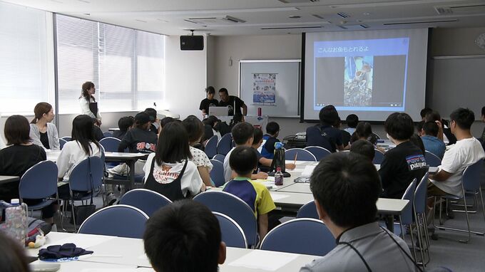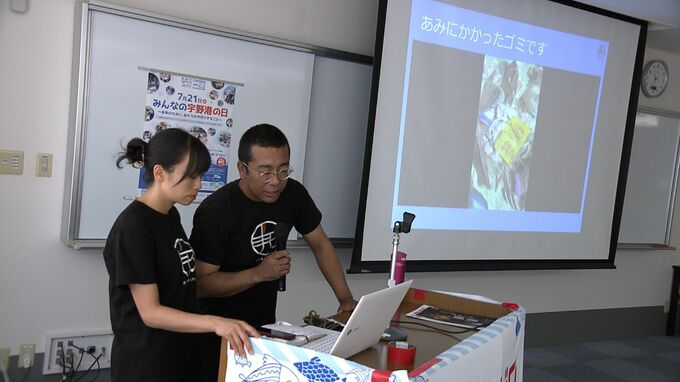 清掃活動のあとは現役漁師の夫婦が講師を務めるワークショップが開かれ、親子連れらが海と魚について楽しく学びました。