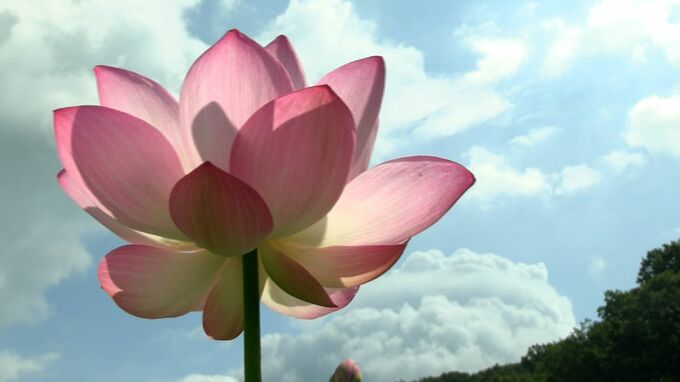 晴れわたる青空の下で輝く大輪の花。久米南町の「宮地やすらぎの里」でハスの花がみごろを迎えています。およそ30年前の1996年、地元有志が休耕田にハスを植えたのが始まりで、今では町の名物として知られるようになりました。