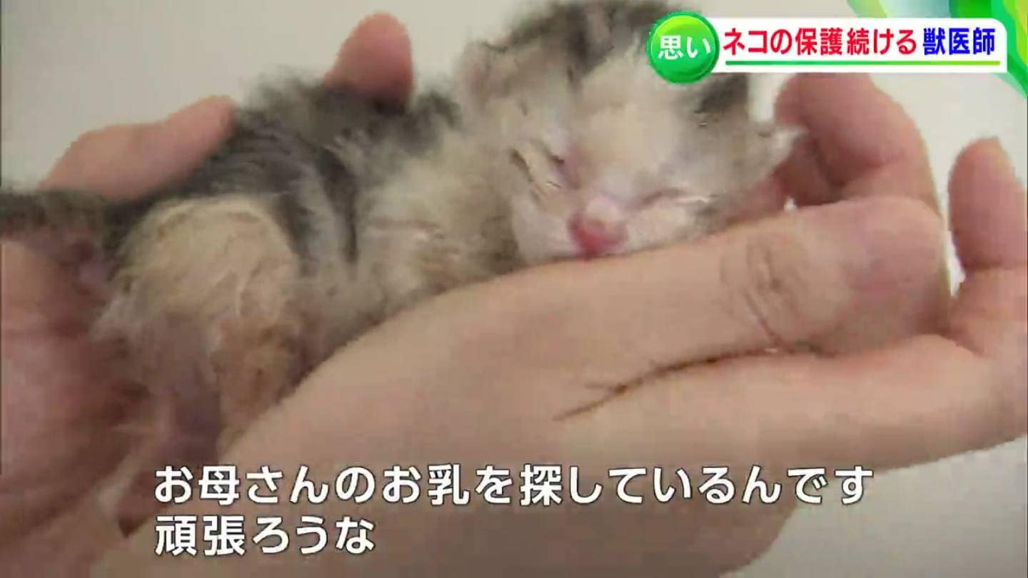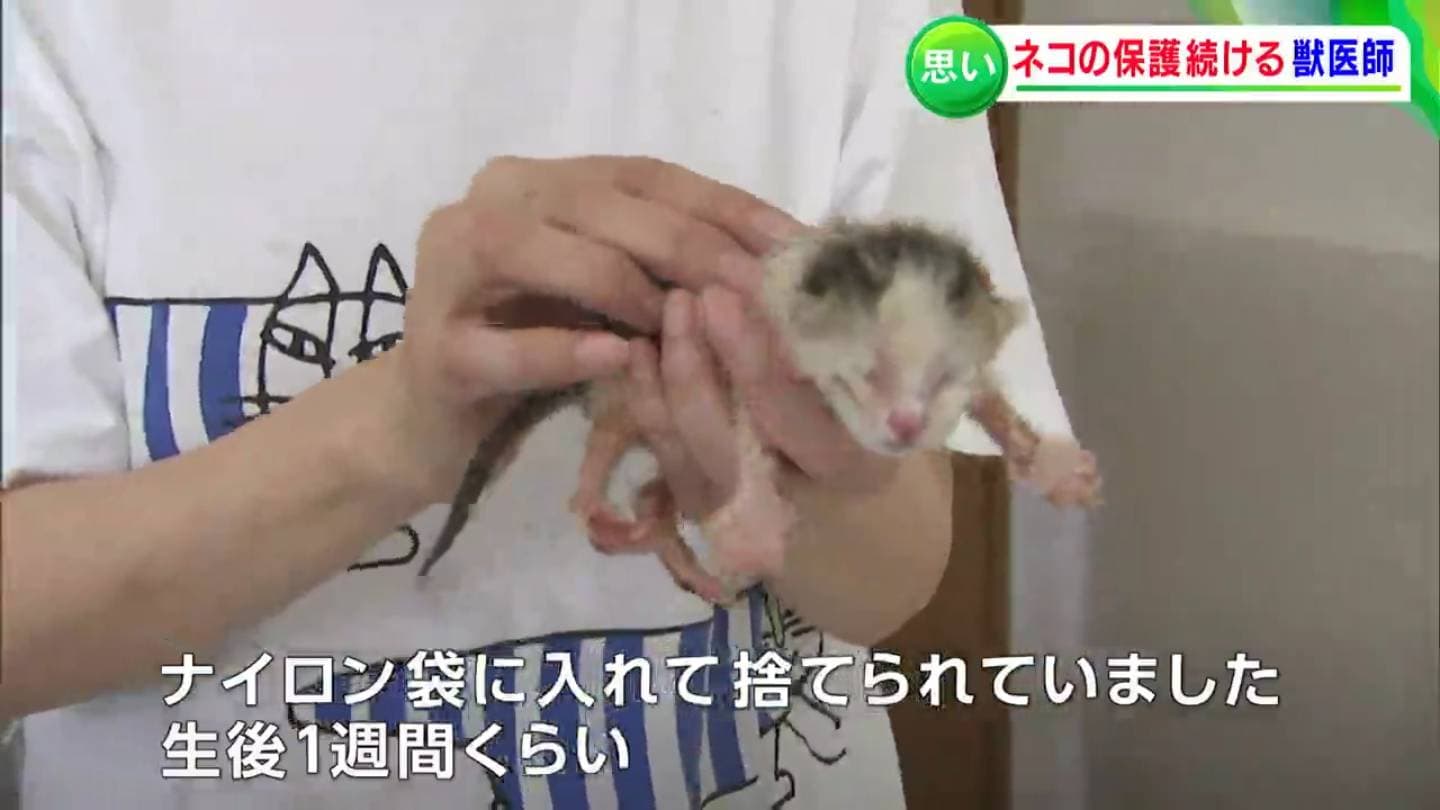 「この子は、ナイロン袋に入れられて捨てられていました。いま一週間くらい。お母さんのお乳を探しているんです。がんばろうな」