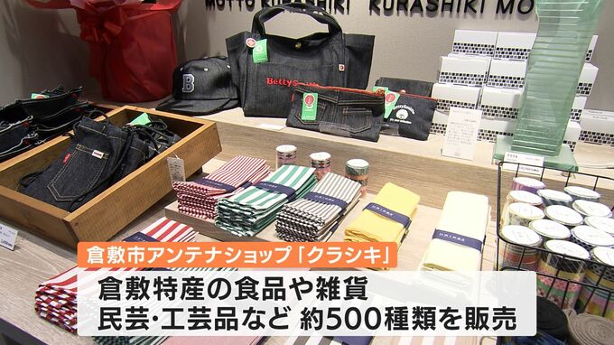 JR大阪駅の西側にきょう(31日)開業した「KITTE大阪」。この2階に出店したのが倉敷市のアンテナショップ「クラシキ」です。美観地区の白壁をイメージした店内では、倉敷特産の食品や雑貨、民芸・工芸品など約500種類が販売されています。全国的に知られるデニムや帆布などの繊維製品。ひとつひとつ手作りの「倉敷ガラス」など特産品が所狭しと並んでいます。