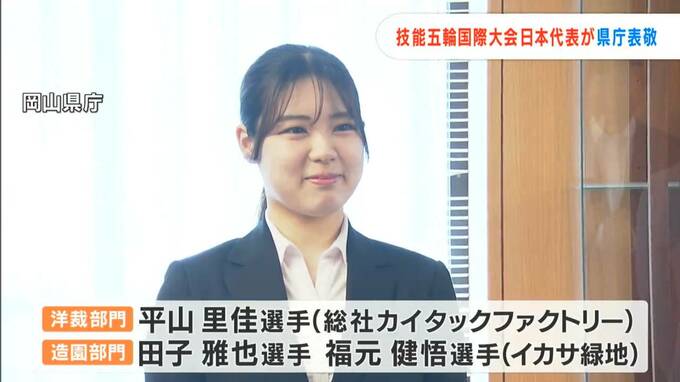 岡山県庁を訪れたのは昨年の全国大会で優勝し来月フランスで開かれる国際大会に出場が決まった3人です。技能五輪大会は、洋裁や造園など59種類の職種ごとに出された課題に挑戦して技を競い合います。