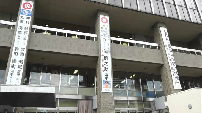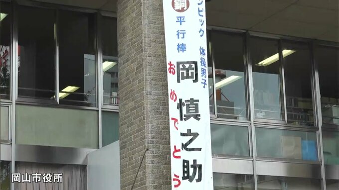 パリオリンピック™の体操男子で、金メダル3個と銅メダル1個を獲得した岡山市出身の岡慎之助選手を称える懸垂幕が岡山市役所に掲げられました。