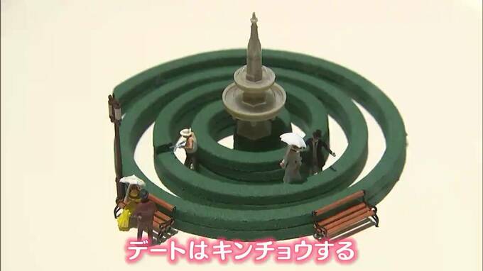 庭園でデートを楽しむ人々。渦を巻いた蚊取り線香を「庭園の緑」に見立てています。