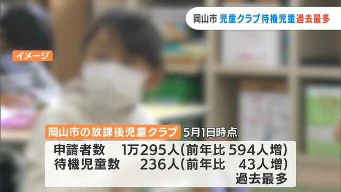 きょうの定例会見で大森市長が発表したものです。岡山市によりますと、市内の放課後児童クラブには、今年度、1万295人の申し込みがありました。このうちクラブを利用できない待機児童は236人と、過去最多を記録していて、申請数に対する市の想定が甘かったことが要因とみられています。
