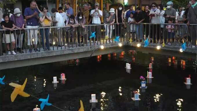 僧侶が読経を行う中、約2500個の灯籠が次々と西川に浮かべられていきます。