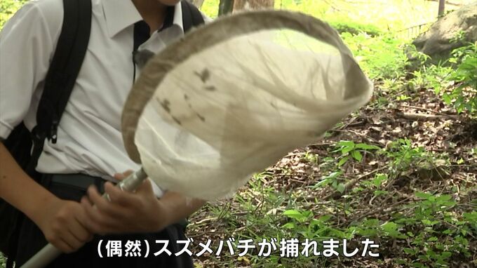 突然、視界に入ったスズメバチを網で捕獲。