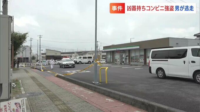 警察によりますと、きょう、午前10時20分ごろ、30歳~40歳くらいの男が女性店員に対し、ナイフのようなものを突きつけ「金を出せ」と脅迫。店にあった現金約10万円を奪い、凶器を持ったまま、逃走したということです。