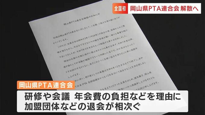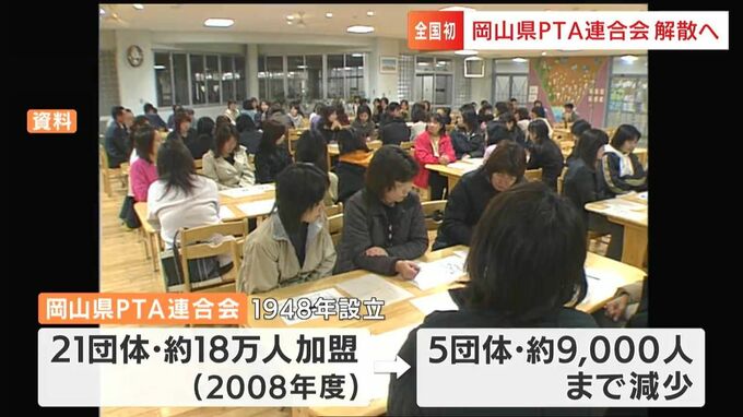 加盟団体の退会が相次いだことを受けて、岡山県PTA連合会は今年度末で解散することを発表しました。都道府県単位の連合会が解散するのは、全国初となります。