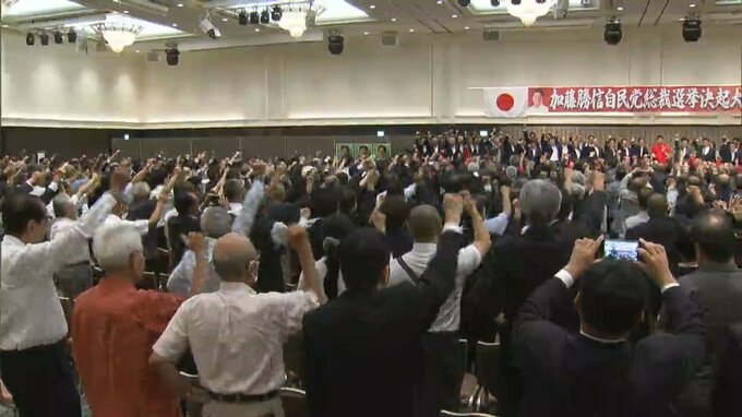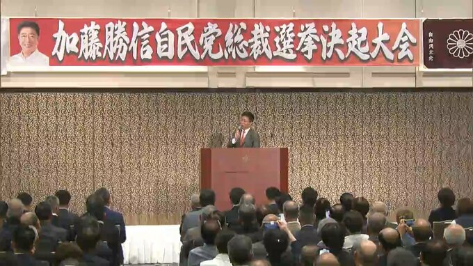 この地方票の獲得を目指そうとけさ(14日)、加藤勝信元官房長官が地元岡山で決起大会を開きました。