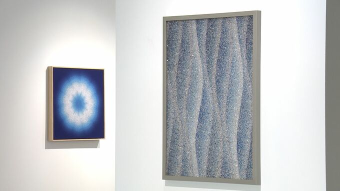 無数の点で描かれた緻密な点描画。近くで見ると、点一つ一つの形や大きさが異なり、また、その色の違いにも驚かされます。岡山市北区建部のギャラリーで開催中の個展。この点描画の作者が、大阪府出身で東京を拠点として活躍する点描画家・GOMAさんです。