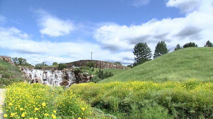 今年は猛暑や少雨の影響で生育にばらつきがあるということですが、9月上旬から開花が一気に進みました。先週までの猛暑が落ち着き過ごしやすい陽気の中、訪れた人は力強く流れる滝とコスモスの競演を楽しんでいました。