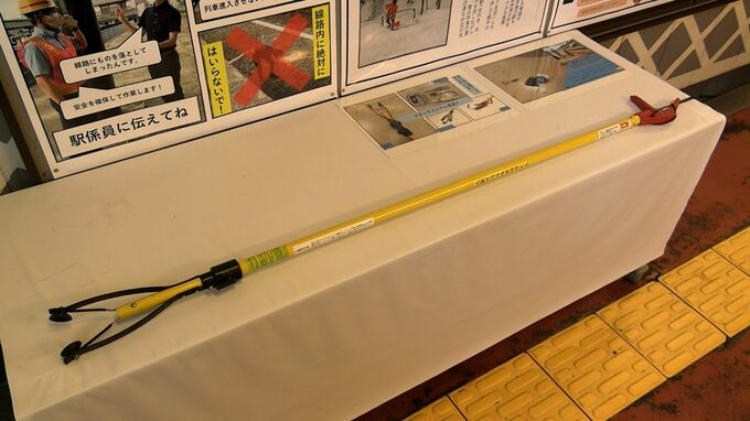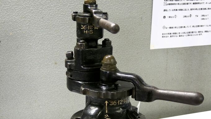 線路に落ちたものを拾う道具「缶キャッチャー」や半世紀以上前に津山線を走っていたというSLのブレーキ弁ハンドル。