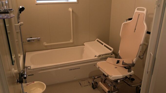 57人が入居できる施設は、身体が自由に動かなくなるパーキンソン病の患者に向け、足の動きを案内する表示のあるトイレや車イスで利用できる浴室、最新のリハビリ器具などを備えます。