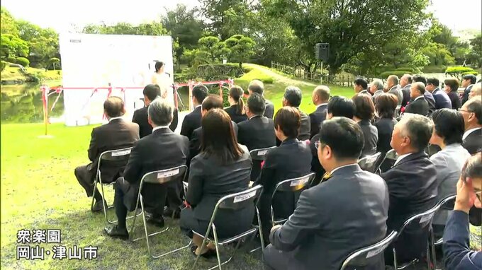 岡山県津山市の衆楽園で行われたセレモニーには、アートディレクターを務める長谷川祐子さんや芸術祭の舞台となる12市町村の関係者らが出席、テープカットをして開幕を祝いました。