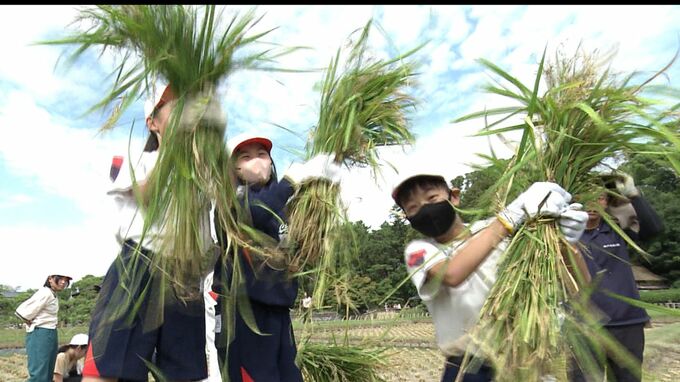 ようやく暑さも落ち着き、収穫の秋です。岡山市北区の岡山後楽園で地元小学生による稲刈り体験が行われました。
