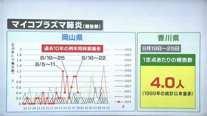 統計の方法が県ごとに違うので一概には言えませんが、岡山県では1医療機関当たりの報告数が8月から9月にかけてのご覧の週で過去10年間の同時期と比較して最多に。香川県では8月の下旬に1定点当たりの報告数が4.0人と1999年の統計開始以降、最多を記録しています。その特徴や現状、さらにはどう対処すればいいのかを医療の現場で聞きました。