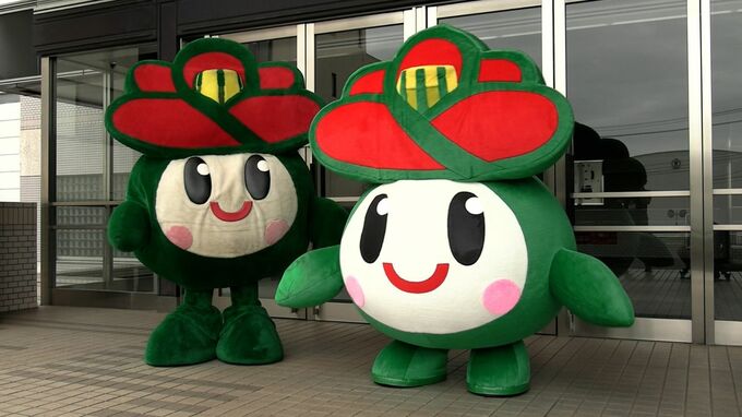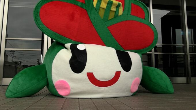 町の花「ツバキ」がモチーフ。里庄町のイメージキャラクター「里ちゃん」です。これまで使われていた着ぐるみは顔の黄ばみや損傷が目立つようになったため、今月、新型の「里ちゃん」にリニューアルしました。資金はクラウドファウンディングで集めました。