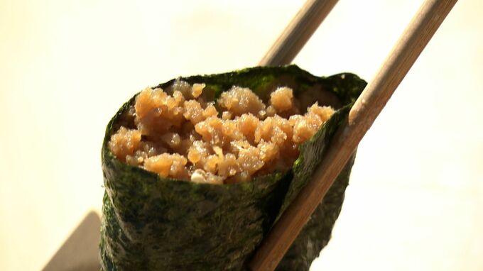 「では、いただきます。ゲタの旨味がぎゅっと詰まっていて、ミンチの甘辛い味付けがご飯とあっておいしいです」