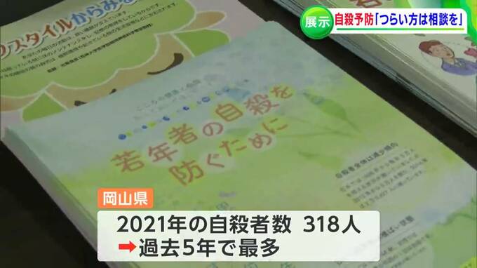 ブースには、相談窓口などが記載されたポスターやチラシが並びます。岡山県では去年318人が自ら命を絶っていて、過去5年間で最多となっています。
