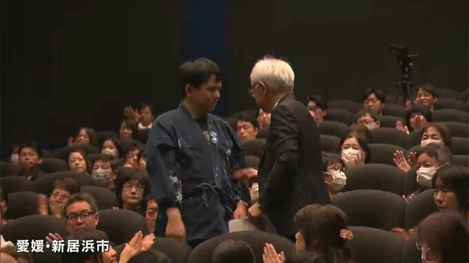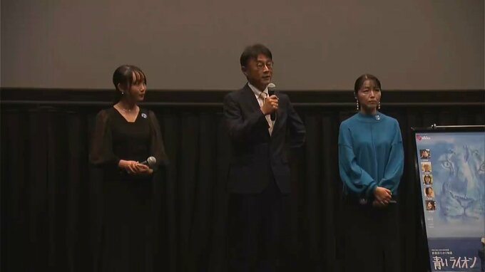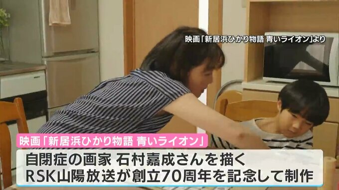 自閉症の画家・石村嘉成さんの映画「青いライオン」の先行上映が行われている愛媛県新居浜市で、出演者や監督の舞台挨拶が行われました。