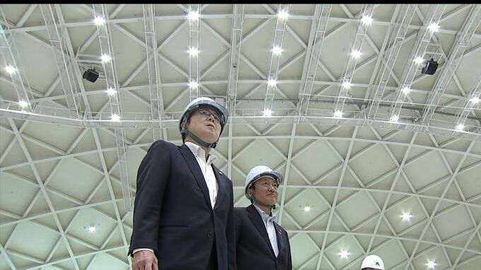 県立アリーナは、2022年4月から高松市のサンポート地区に約200億円を投じて建設を進めてきたものです。池田知事と大西市長はトップ会談の一環として視察に訪れ、ほぼ完成したアリーナの中を県の担当者の説明を受けながら見て回りました。