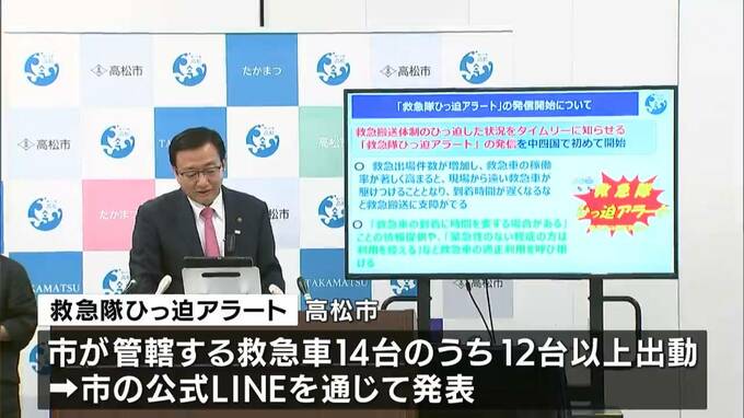 定例の記者会見で大西高松市長が発表しました。高松市では、今年の救急車の出動件数が今月22日までに2万1966件と、過去最多の去年より418件増加しています。こうしたことから高松市では効果的な利用を呼びかけようと「救急隊ひっ迫アラート」の運用を決めたということです。