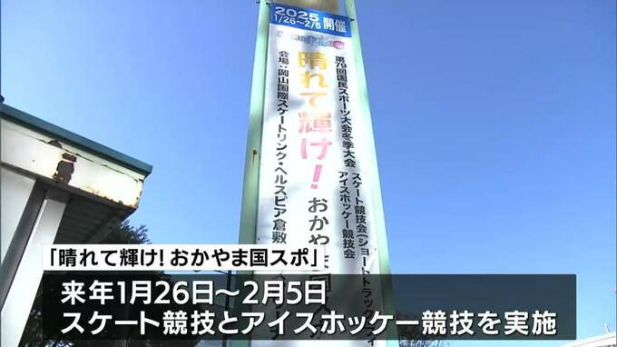 開催まで100日を切った冬季・国民スポーツ大会を、2つの競技が開催される岡山でも盛り上げようと懸垂幕が掲げられました。