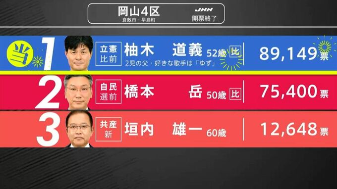 岡山4区は立憲民主党の柚木道義さんが自民党の橋本岳さんとの激戦を制しました。柚木さんが小選挙区で勝利するのは2009年以来です。
