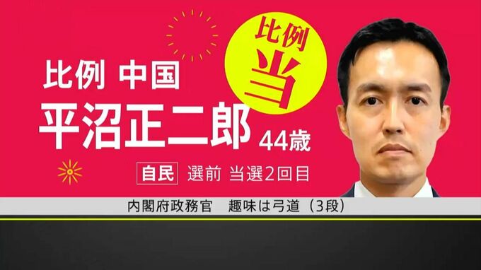 比例代表・中国ブロックでは自民党の平沼正二郎さんが2回目の当選です。