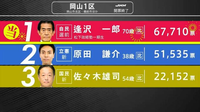 岡山1区は自民党の逢沢一郎さんが立憲民主党の原田謙介さんの追い上げを振り切り、13回目の当選です。