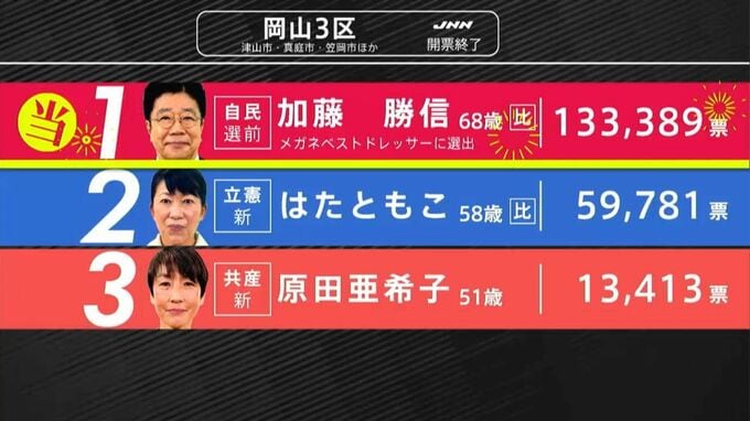 岡山3区は財務大臣の加藤勝信さんが高い知名度で圧倒し、8選を果たしました。