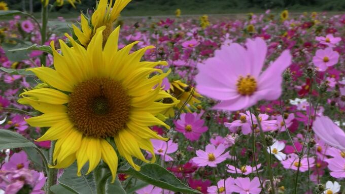 「びっくりしました」笠岡ベイファームでコスモスとヒマワリが競演【岡山】 2024年10月29日(火) 17:30 岡山 季節を越えた花の競演です。四季折々の花を楽しむことができる岡山県笠岡市の道の駅で満開を迎えたコスモス畑にヒマワリが咲きました。色あざやかなコスモスのそばに咲いているのは…ヒマワリです。笠岡市にある道…