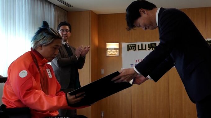 岡山県庁で行われた授与式に出席した佐藤友祈選手です。「岡山県の名を高め県民の誇りとなる素晴らしい功績」だとして伊原木知事から県民栄誉賞が贈られました。