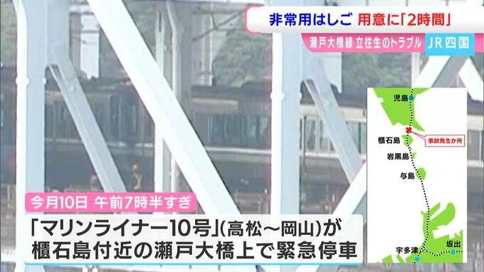 このトラブルは、今月10日午前7時半すぎ、高松発岡山行きの上り快速列車「マリンライナー10号」が、児島駅から約4キロ手前の櫃石島付近の瀬戸大橋上で緊急停車し、乗客150人が約6時間にわたり閉じ込められたものです。