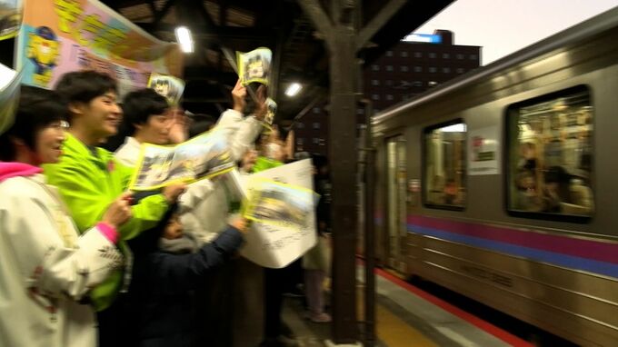 きのうの夕方、津山駅ではアートディレクターの長谷川祐子さんが谷口圭三津山市長らとともに芸術祭閉幕のセレモニーとして観光客を乗せたバスや列車を見送りました。