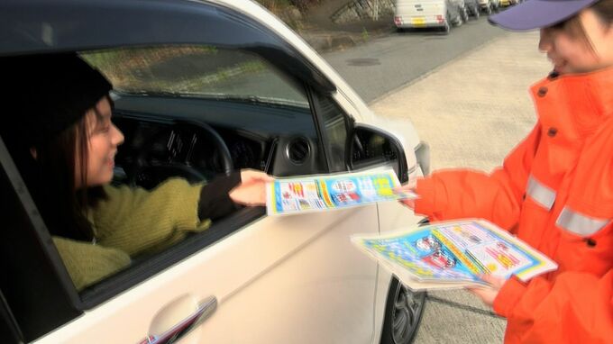 降雪シーズンを前に、岡山県奈義町で冬用タイヤの早期装着とチェーンの携行を呼びかける啓発活動が行われました。