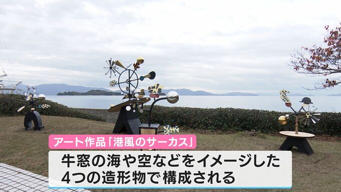 瀬戸内市の牛窓ヨットハーバー南側公園に設置されたのは「港風(みなとかぜ)のサーカス」です。牛窓の海や空などをイメージした4つの造形物で構成されるアート作品です。瀬戸内市では地域活性化に繋がればと去年から市内各地にアート作品を設置するプロジェクトに取り組んでいて、今回の作品はその第三弾です。