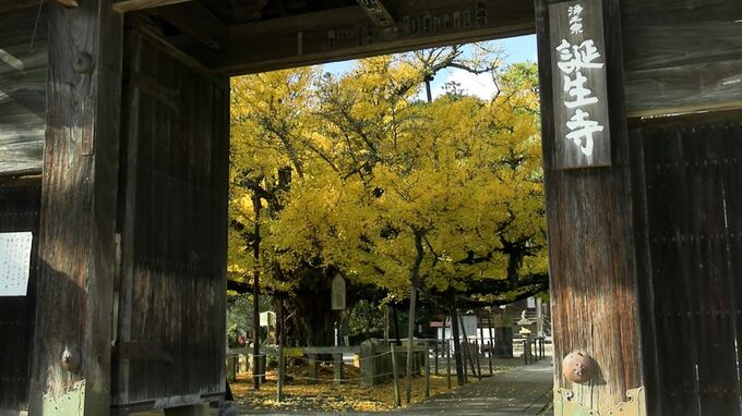 樹齢約880年、高さ10メートルの大イチョウです。浄土宗の開祖・法然上人が生まれた地とされる誕生寺。その境内にそびえたつ“逆木(さかき)のイチョウ”です。法然上人が杖として使っていたイチョウの枝を逆さまに挿したところ、たちまち根付いたという言い伝えが名前の由来になっています。風が吹くたびに黄金色の葉が舞い、訪れた人を楽しませていました。
