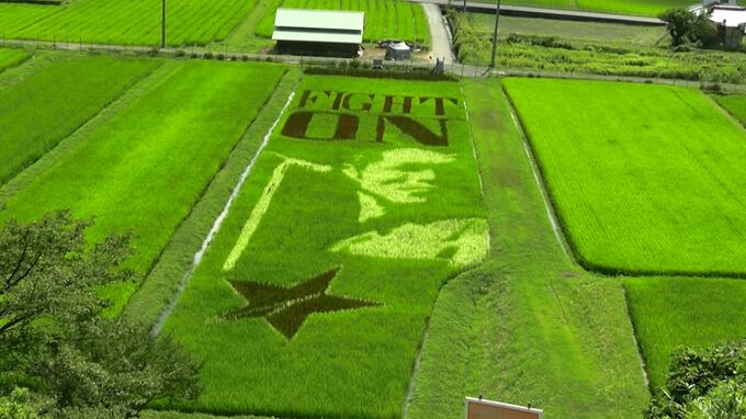 美作市の名物“永ちゃん田んぼ”です。7月末には矢沢永吉さんの今年のツアータイトル「ファイトオン」の文字とともにスーパースターの姿がはっきりと浮かび上がり、県内外から多くのファンが見物に訪れました。