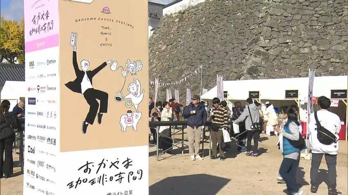 岡山城で行われているイベント「おかやま珈琲時間」です。岡山県内や近県の人気のロースタリー約30店舗が集まりました。カップと試飲用のコインのセットを買うなどして巡ることができ、開場とともに多くの来場者が、焙煎や淹れ方にこだわったコーヒーを楽しんでいました。