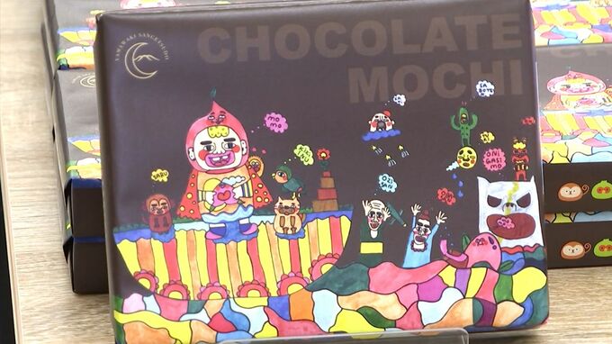 きょうから先行販売が始まった「チョコレートきびだんご」です。桃太郎一行が七色の海を渡って、鬼が島へ向かう様子が描かれています。包装紙の絵は、発達障害のあるアーティストカナピさんが描いたもの。