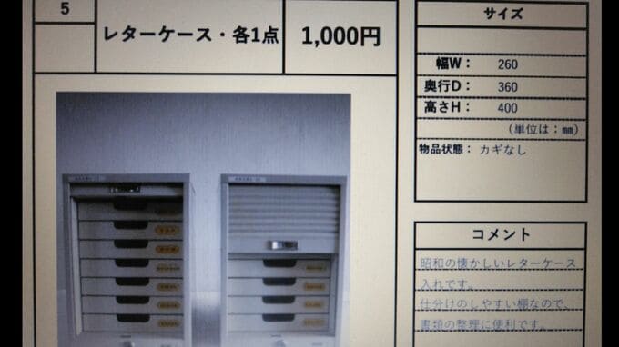 たとえば、応接室で使っていたと思われるローテーブルは、大きさなどが細かく表示され、「和室にいかがですか。 書斎用、家族の団欒用としても温かみが感じられるテーブルです」という推薦コメント。ものを大切にする担当者の思いが伝わってきます。