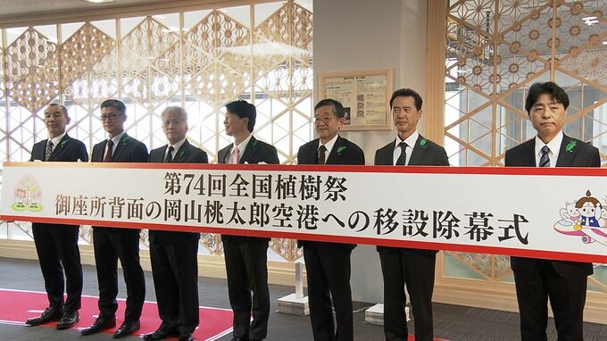 植樹祭で飾られた組子装飾が岡山空港に移設 森林・環境保全への思いなどを後世に伝えていくため 2024年12月4日(水) 17:30 岡山 今年5月、岡山市北区を会場に行われた全国植樹祭。その意義を、後世に伝えていこうと、会場を飾った組子装飾が岡山空港に移設されました。きょう(4日)、お披露目されたのは横9メートル、縦3メートルほどの組子装飾…