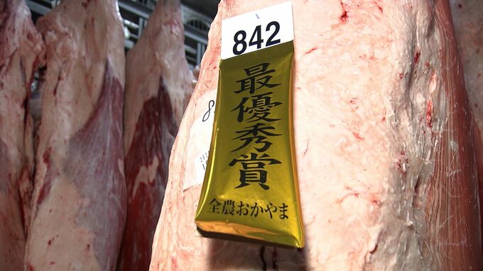 食肉生産技術の向上を目指してJA全農岡山が毎年開いているもので、今年は、牛や豚、130頭の枝肉が出品されました。霜降りの状態や各部位のバランスなど肉質に重点を置いた審査を経て、和牛去勢の部・雌の部と豚の3部門で17点が最優秀賞に選ばれました。