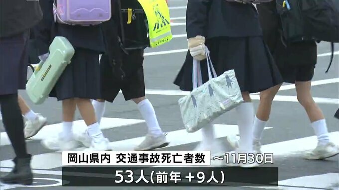 先月(11月)までの、岡山県内での交通事故死者数は53人と、前年に比べ9人増加。横断歩道を歩行中の死亡事故は先月2件発生し、今月(12月)3日には小学生が車にはねられ重体となっています。これを受け、今回緊急対策として交通指導が行われたものです。